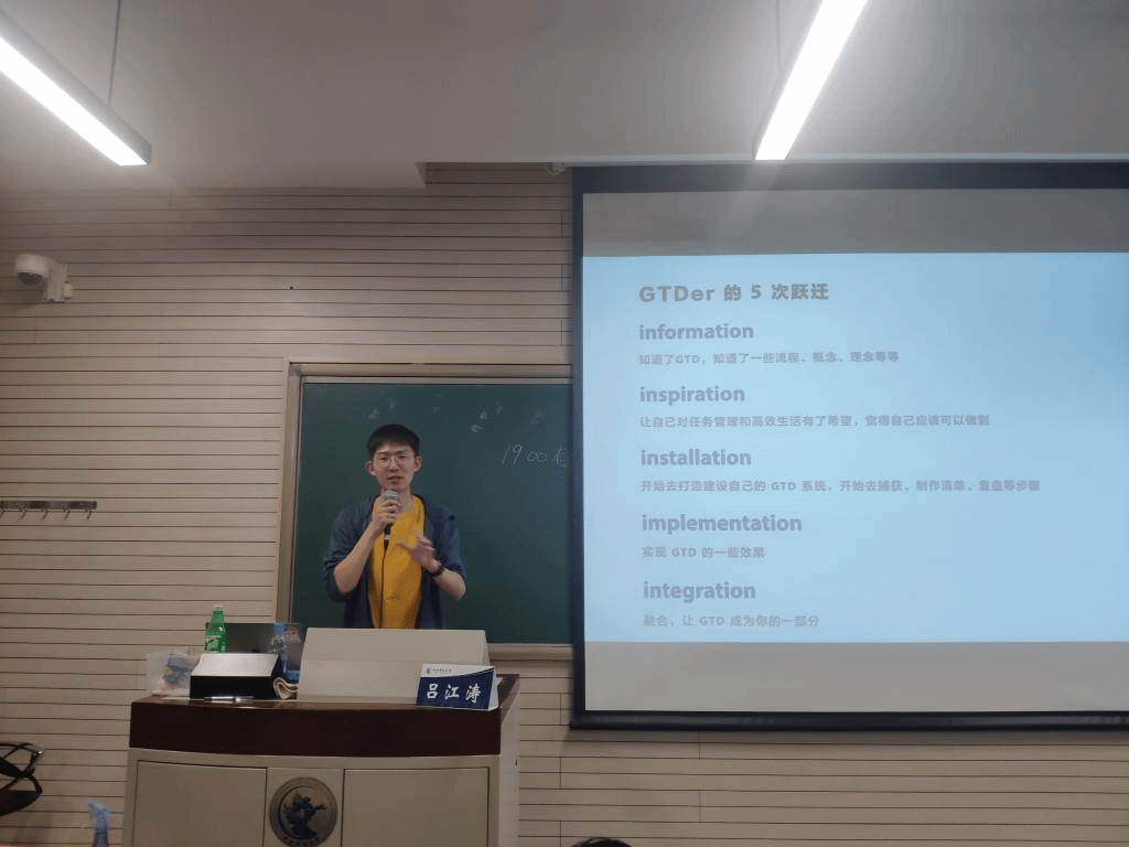 吕先生引出任务管理的核心步骤,并通过亲自展示自己的电脑桌面和所使用的App来演示任务管理的具体流程:第一步,收集+捕获(capture),吕先生告诫同学们不要相信大脑,要善于利用纸、笔、电脑等记录下来要做的事情,“物来则现,物去不留,事来则应,事过即忘”;第二步,整理(settlement),对待办事项进行归纳,秉承“2分钟原则”;第三部,执行(execution),通过时间管理类App对待办事项进行充分执行、立即执行、彻底执行;第四步,检查(review),其目的是有效保障待办事项的健康运转。吕先生建议同学们养成时间管理的好习惯,有意打造自己对已完成任务、待完成任务“SOP”(标准化流程Standard Operating Procedures)。