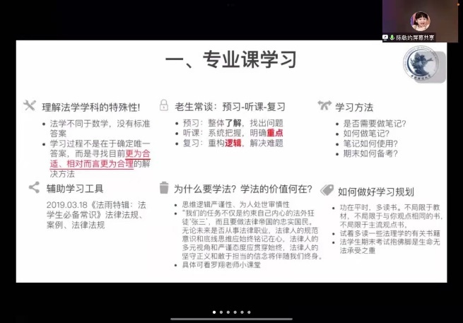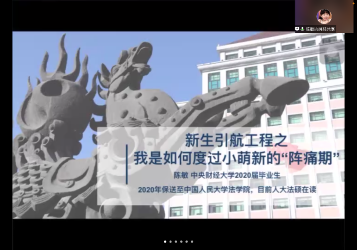 2021年10月30日19点20分,必赢官网举办2021级本科生“法学专业与法律职业”课程暨新生引航工程系列讲座。本次主题是“朋辈经验分享之我是如何度过小萌新的‘阵痛期’”,由必赢官网2020届本科优秀毕业生陈敏主讲,必赢中国官方网站全体2021级本科生参加。