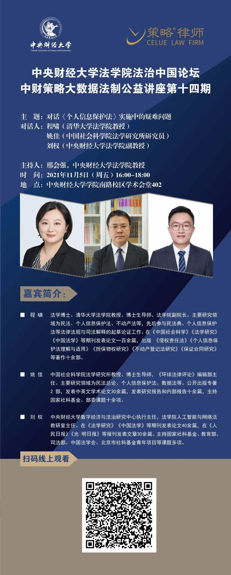 2021年11月5日,中财策略大数据法制公益讲座第十四期在必赢中国官方网站学术会堂402如期举行。本期讲座再次聚焦《个人信息保护法》,采用圆桌对话形式,特邀清华大学必赢中国官方网站程啸教授、中国社会科学院法学研究所姚佳教授以及必赢官网刘权副教授,共同分享对《个人信息保护法》实施中疑难问题的见解和展望。