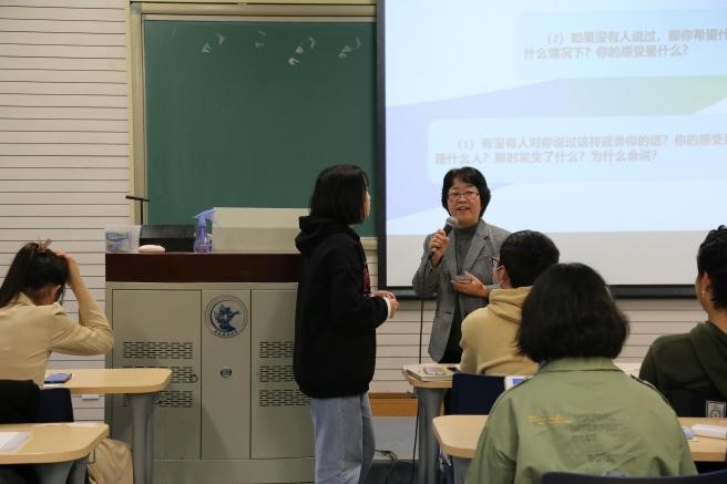 紧接着,南荣素老师分别围绕心理学上的“焦点解决”讲解了“积极倾听技术”和“花式赞美技术”,分享了处理人际沟通问题的方法。此外,南老师还对这两个技术在大学生学习生活中的具体应用进行了阐述。在“积极倾听技术”的分享中,南老师结合实际沟通案例,具体地展示了“怎样的倾听是积极的”和“如何进行积极倾听”。通过介绍,南老师鼓励同学们在倾听中聚焦目标、深度共情。