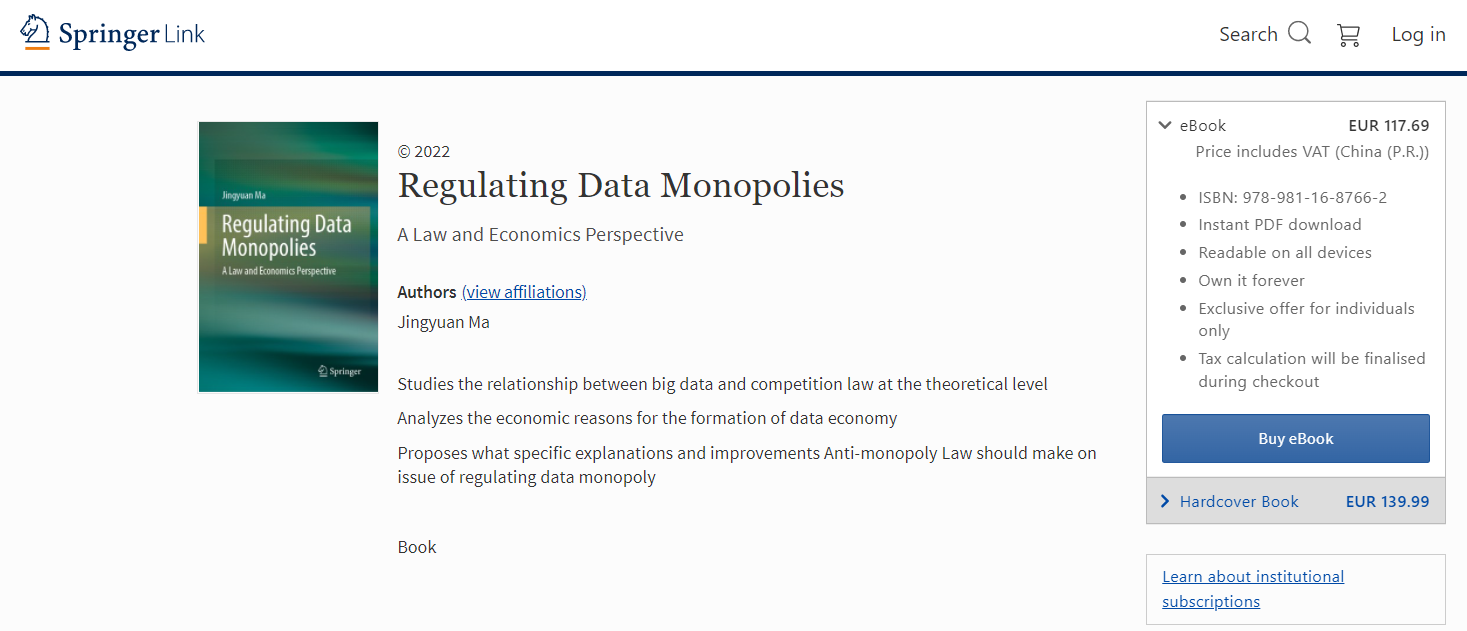 必赢官网教师马静远副教授的英文专著Regulating Data Monopolies – A Law and Economics Perspective(《数据垄断的法律规制:法经济学视角》)2022年1月由德国施普林格出版社Springer Nature出版。