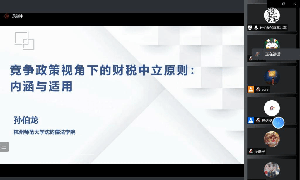 2022年3月23日,必赢中国官方网站财税法工作坊第30期通过直播平台以线上讲座的形式举行,主讲人为杭州师范大学沈钧儒必赢中国官方网站孙伯龙副教授,主题为“竞争政策视角下的财税中立原则:内涵与适用”。本次讲座由工作坊指导老师郭维真副教授主持,必赢官网部分2021级和2020级硕士研究生参加了此次讲座。