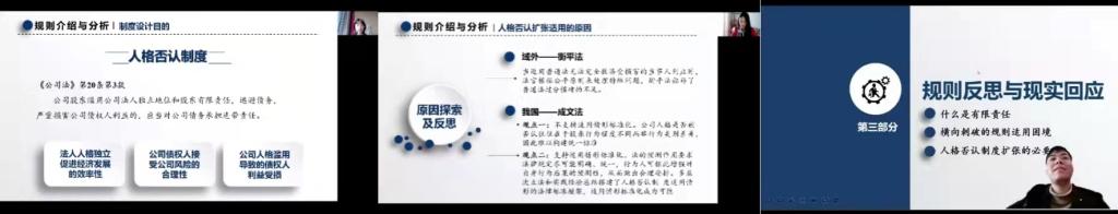 随后,2021级本科生贺孟攀同学从条文出发,反思了当前以个案方式处理人格否认问题的合理性,提出了对公司人格独立地位完全丧失可能性的思考。孙呈玥同学向老师提出了人格否认规定是否应当进一步规范化的疑问,王汉申同学从制度灵活使用和条文规制间的平衡出发,就人格否认未来发展方向何在向老师提问。周游老师和徐可老师对上述问题予以了充分且详细的解答,同学们收获颇丰。