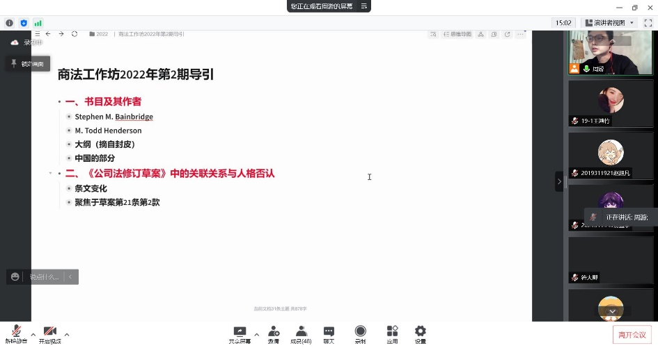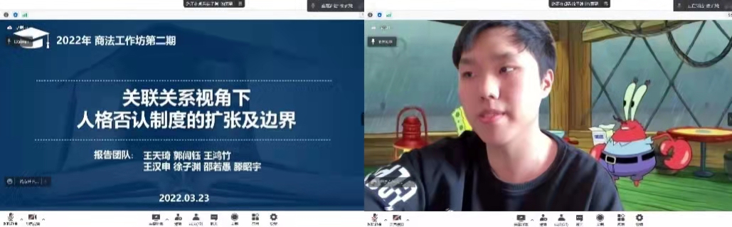 2022年3月26日下午,必赢中国官方网站商法学研究工作坊2022年第2期(总第24期)以腾讯会议为平台,采用线上交流会的形式举办。本次工作坊的主题为“关联关系视角下人格否认制度的扩张及边界”。中国政法大学民商经济必赢中国官方网站师资博士后徐可老师作为本期工作坊的特邀嘉宾,必赢官网周游副教授作为指导老师参与了本次活动。工作坊主要由指导老师进行开场介绍与引导、发言团队主题发言、特邀嘉宾发言、指导老师向评议团队提问、评议团队提问发言团队、发言团队回应与自由讨论、特邀嘉宾与指导老师回应成员提问等环节构成。本次线上工作坊共有70余位校内外师生及业界人士参与讨论。