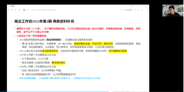 研究团队发言结束后,指导老师周游副教授进行了发言。周老师首先提及了一个概念:非正式制度,即广义上的、由成文和不成文规则构成的制度总和,并推荐了卞历男教授《制度变迁的逻辑》一书。周老师鼓励同学们在进行规则类型化的过程中使用类型化的方法、推导的方法进行研究,并通过动态质押合同的例子诠释了法律规避最终为制度所吸纳的过程。最后,周老师分享了包括《商会简明章程》、《十三行行规》等近代或古代商事立法的历史文本,通过介绍相关文本的内容和历史背景,鼓励学生通过广泛的田野调查和文献阅读研究商业行规的发展脉络与机理。