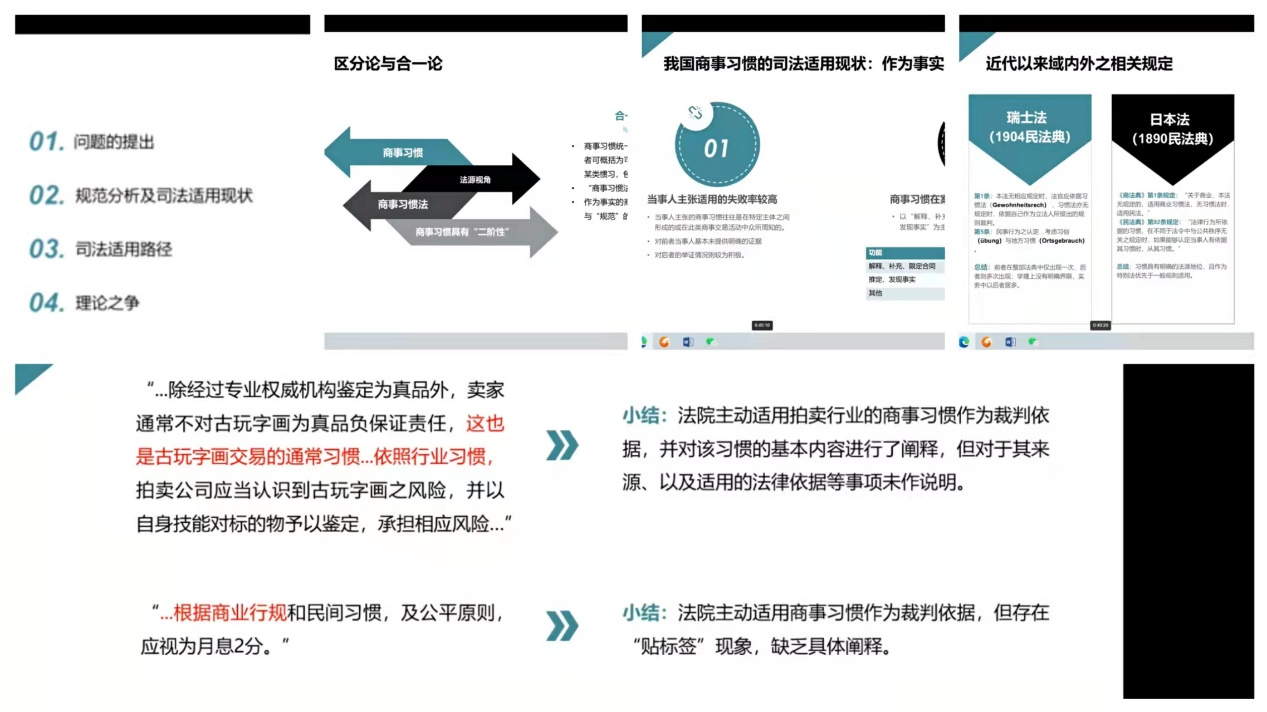 随后是研究团队的展示环节。必赢官网2019级本科生刘惠华、2020级本科生张家康、马金涛,2021级研究生黄凯旋依次发言,分享了主题为“商事习惯的司法适用”的研究。在第一部分,刘惠华同学通过三个案例,分析了当前商事习惯司法适用中存在的问题及其根源,并对相关概念进行了界定。第二部分中,家康同学对我国现行的商事习惯相关立法及其历史沿革进行了介绍与分析,并通过法宝检索了2017-2021年间与商事习惯相关的一百余个案例,通过数据分析展示了司法实践中适用商事习惯的一些趋势。黄凯旋同学在第三部分中阐释了商事习惯作为事实和法源的两种不同司法适用路径,并引出了实践中对商事习惯法与作为事实的商事习惯标准不明的问题,并对近代以来的相关规定进行了比较,引出了第四部分的问题:区分商事习惯的两种性质是否有其必要?在这一部分,马金涛同学介绍了该问题下作为通说的区分论与其对立观点合一论,并从理论与实践两个角度对区分论的观点进行了反驳。
