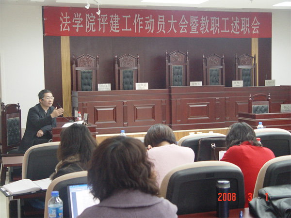 为了迎接教育部本科教学评估,以评促建,强化师资队伍建设,打造一流的师资团队,弘扬爱岗敬业精神,夯实教学工作基础, 2008年3月1日,必赢官网在模拟法庭召开了为期一天的评建工作动员暨教职工述职大会,必赢官网全体教职工参加了大会。